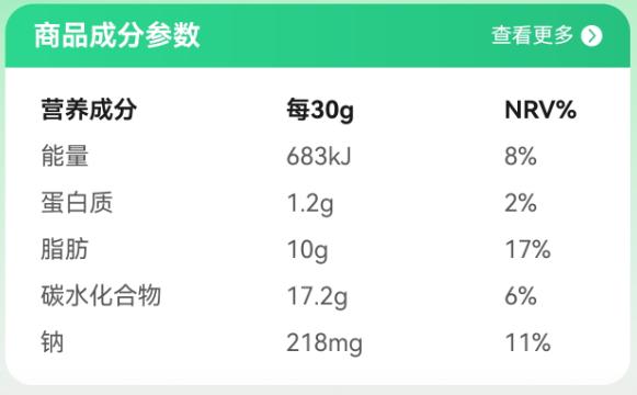 以下面這款薯片為例,圖中的含量是每 30 克的,換算成每 100 克的含量,相當于含有脂肪 33 克(約占成年輕體力女性每日推薦攝入量的 70%)、鈉 727 毫克(接近每日建議量的 50%)。