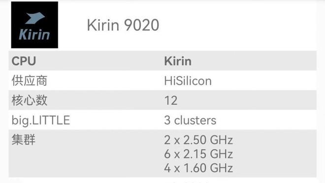 其中旗艦核心是麒麟9020(滿血版),CPU采用創(chuàng)新的1*2.50GHz泰山超大核+3*2.15GHz泰山大核+4*1.60GHz自研小核的八核心設(shè)計。