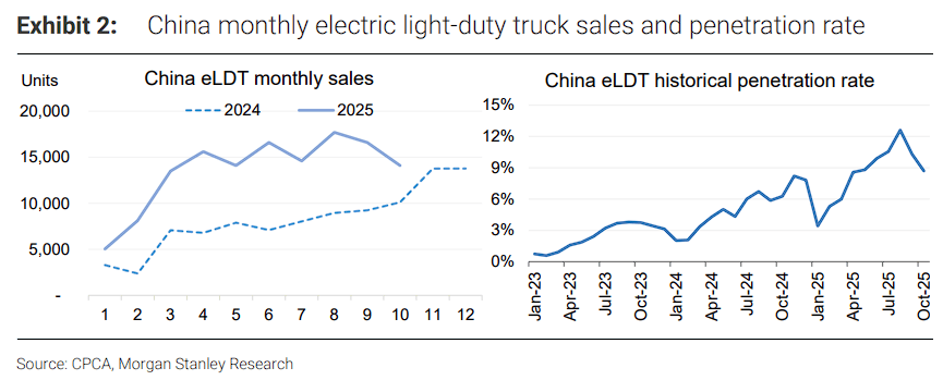 如果說重卡是“先鋒”,那么輕卡就是即將爆發的“主力軍”。大摩表示,2025年10月,電動輕卡銷量同比增長40%,而年初至今的累計銷量同比增長則高達92%。