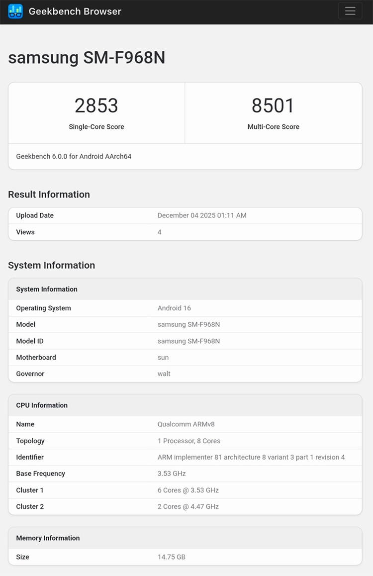 根據相關媒體報道,三星Galaxy Z TriFold在GeekBench 6.0.0版本的跑分,單核成績為2853分,多核成績為8501分。同時該媒體表示,對比高通驍龍8 Elite的官方基準數據,三星三折疊手機單核成績低了9.6%,多核成績低了12.6%。