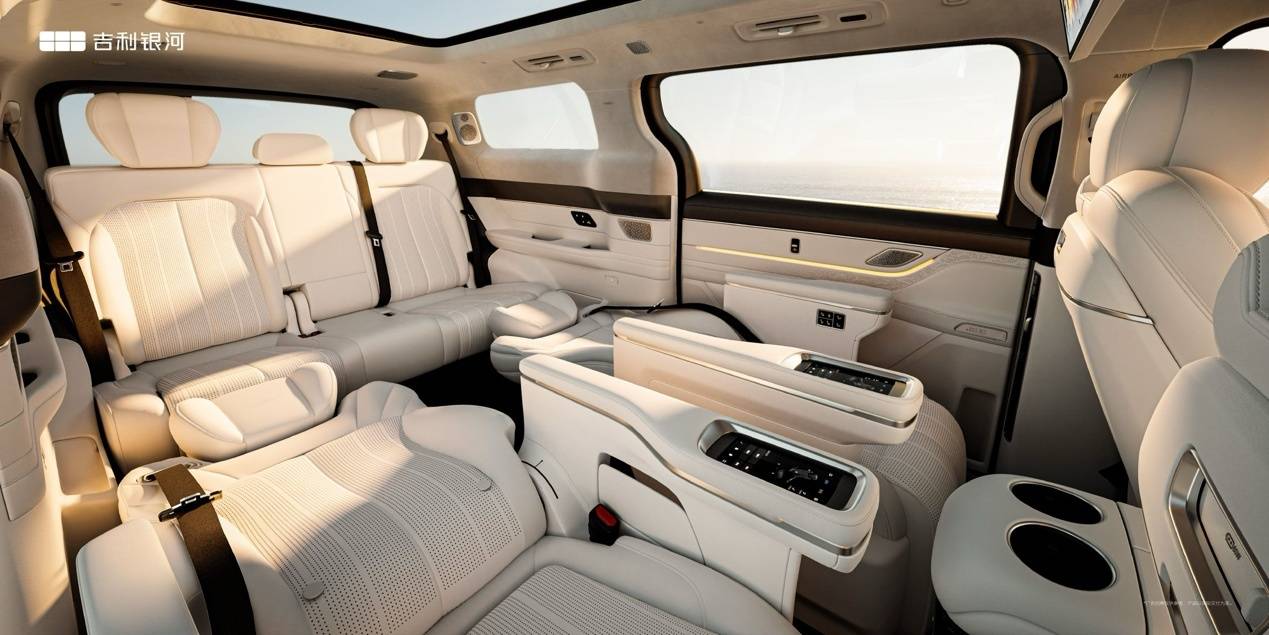 內飾空間布局上,銀河V900提供6/7/8座三種選擇,二排與三排空間均超過1013mm,后備箱容積達1100L。座椅采用Nappa全粒面真皮包裹,支持加熱、通風、SPA級按摩及電動調節功能,后排配備17.3英寸娛樂屏。科技配置方面,新車搭載Flyme Auto 2.0車機系統,內置驍龍8295P旗艦芯片,集成DeepSeek與吉利自研星睿AI大模型,全車配備4個50W風冷無線快充。